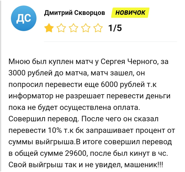 В канале Договорные Матчи Сергей Черный отзывы от своих довольных клиентов не публикует. Зато они имеются в интернете, причем, только отрицательные. Например, Дмитрий Скворцов делится, что купил у Сергея Черного договорной матч. Он не зашел, поэтому аналитик попросил перевести ему еще 6 тысяч рублей, так как информатор не позволяет перевести деньги, пока не осуществлена оплата. Дмитрий совершил еще один перевод.