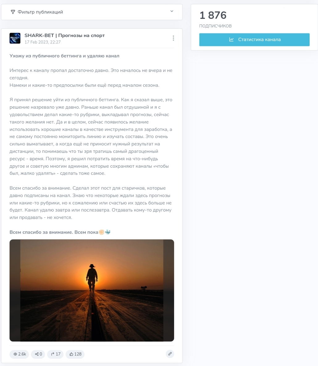 На данный момент TG Shark Bet не функционирует, аналитик перестал публиковать посты и сообщил о завершении работы канала по причине потери интереса и результатов, которые не оправдывают усилий. Во время работы проекта в среднем 2 тыс. подписчиков просматривали ленту, аудитория была немногочисленной, но достаточно активной.