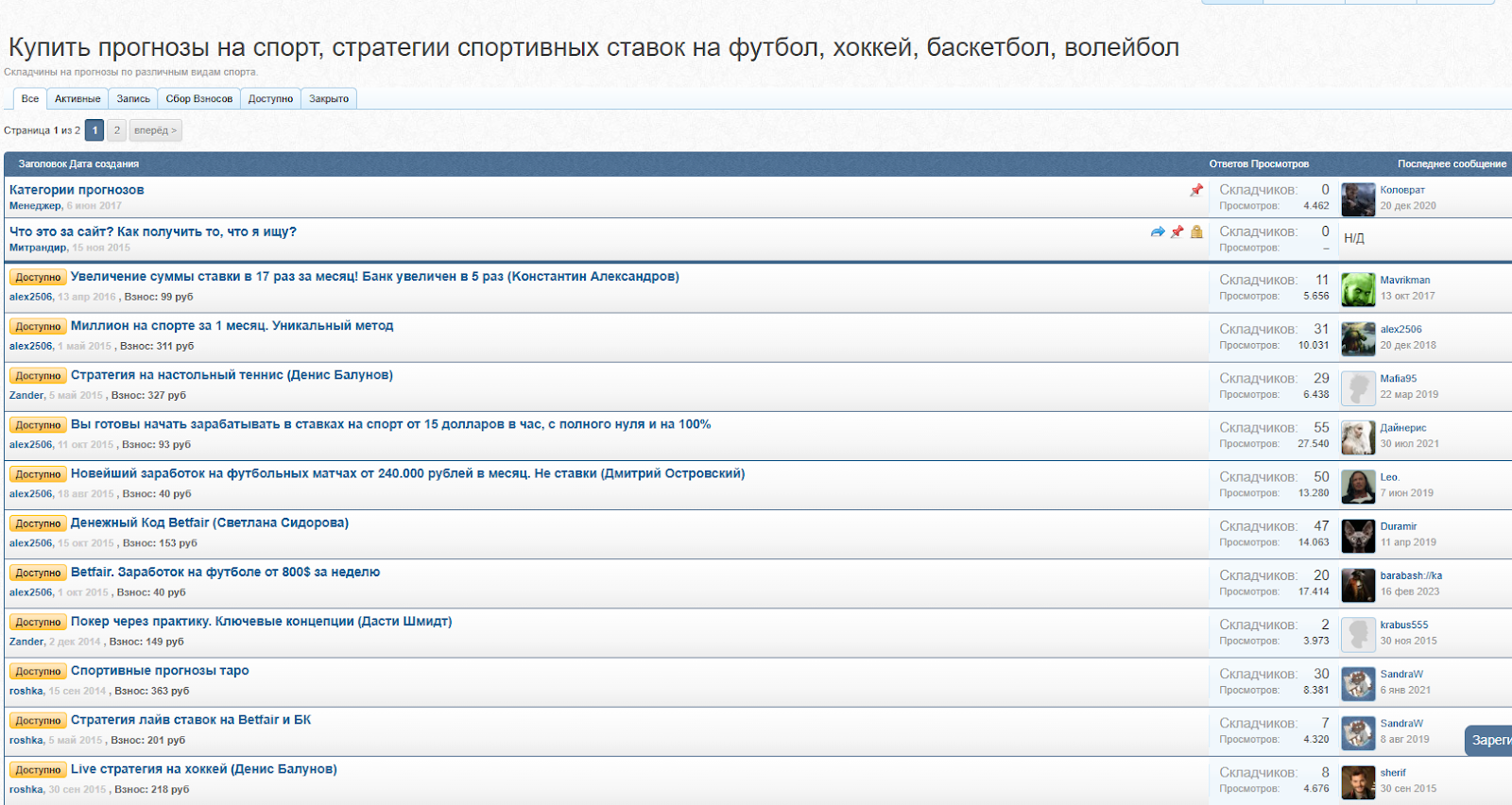 В разделе со ставками вы найдете несколько тем, в которых люди собирают деньги на покупку прогнозов и стратегий разных каперов. Обычно цены у этих прогнозистов достаточно высокие, но Складчина Биз позволяет получать доступ к их услугам за 40-300 рублей. В качестве важного минуса стоит отметить, что на данный момент предложений по беттингу почти нет. Новые темы отсутствуют, а старые висят незакрытыми уже несколько лет.
