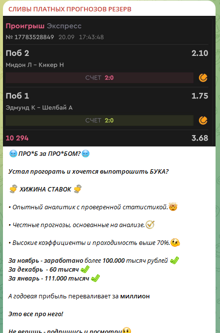 Пользователям предлагается написать в личные сообщения и узнать стоимость «доли» в покупке прогноза. Средняя цена составляет 300–1000 рублей за участие. Такая модель исключает прозрачность. У пользователей нет возможности заранее ознакомиться с условиями сделки. А еще отсутствуют гарантии возврата средств и доказательства того, что прогноз действительно куплен у другого аналитика.