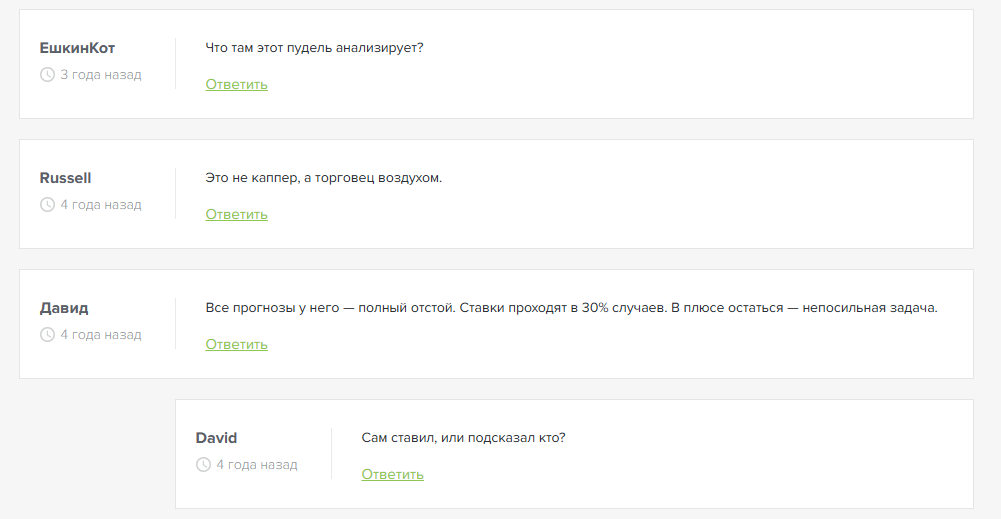 Админ Sport Analytics не делится отзывами от покупателей экспрессов. Но в интернете мы нашли много жалоб на этого капера. Люди пишут о том, что заработать с ним невозможно, а проходимость гораздо ниже заявленной.