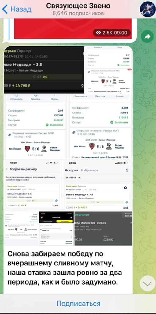 В закрытом клубе клиенты получают 2 ставки по инсайдерской информации с коэффициентами от 2 каждый день. Для получения доступа в группе на месяц нужно заплатить 10 000 рублей. Вот только торгуют якобы инсайдерской информацией мошенники. Настоящие данные о подставных матчах не продаются в интернете даже за большие деньги.