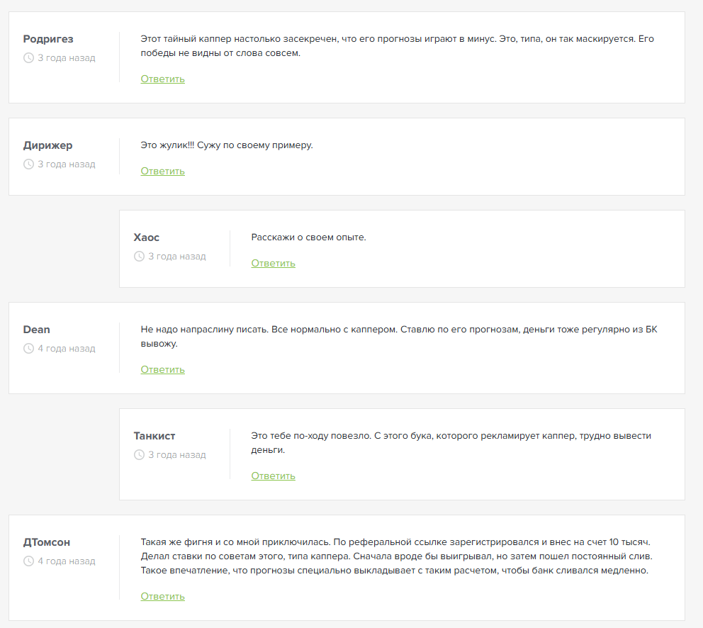 На канале закрыты комментарии, поэтому узнать мнение подписчиков невозможно. Но на сторонних ресурсах много негативных отзывов, в которых пользователи рассказывают о неудачном опыте работы с каналом Тайный Каппер. Большинство из них потеряли свои деньги, ставя по советам админа.