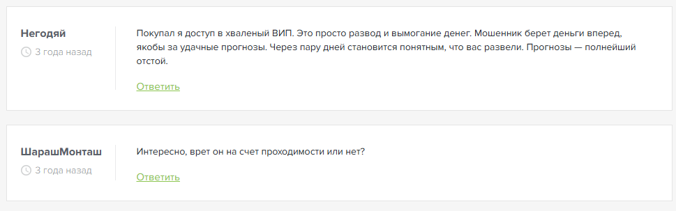 Очередная разводка лохов! Купил доступ в этот ваш вип канал ждал крутых ставок а получил полный провал деньги слиты впустую! Эти ребята умеют лишь красивые рассказы сочинять реальные прогнозы увы никакущие.