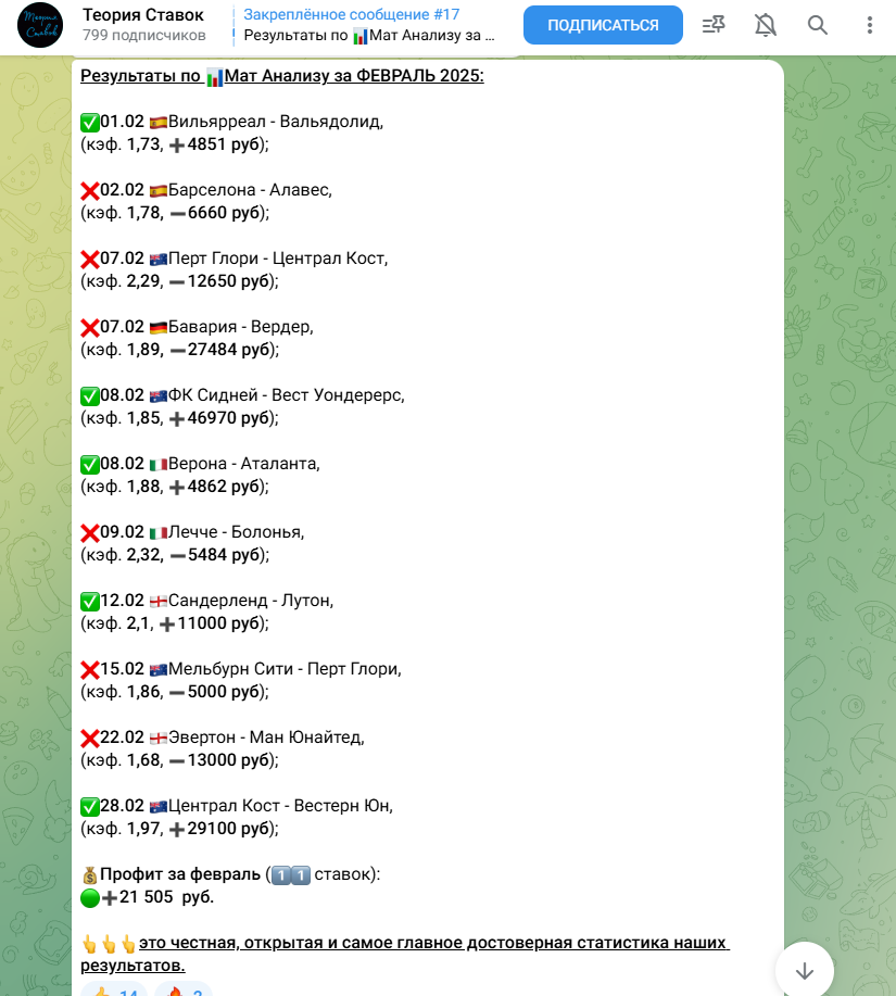 Но админ канала Теория Ставок и не дает никаких гарантий успеха. Он ведет детальную статистику по каждому месяцу. Согласно ей проходимость находится около 50%, но высокие коэффициенты позволяют ежемесячно выходить в плюс. Отметим, что статистика не верифицирована, поэтому может оказаться ложной.