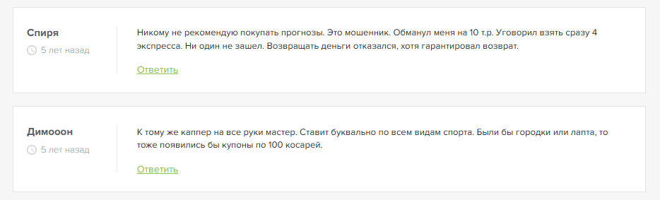 Независимых отзывов о канале почти нет. В телеграм публикуются только положительные комментарии, которые капер стимулирует бесплатными прогнозами. Верификаторы при этом не используются, отчетов или статистики по ставкам тоже нет.