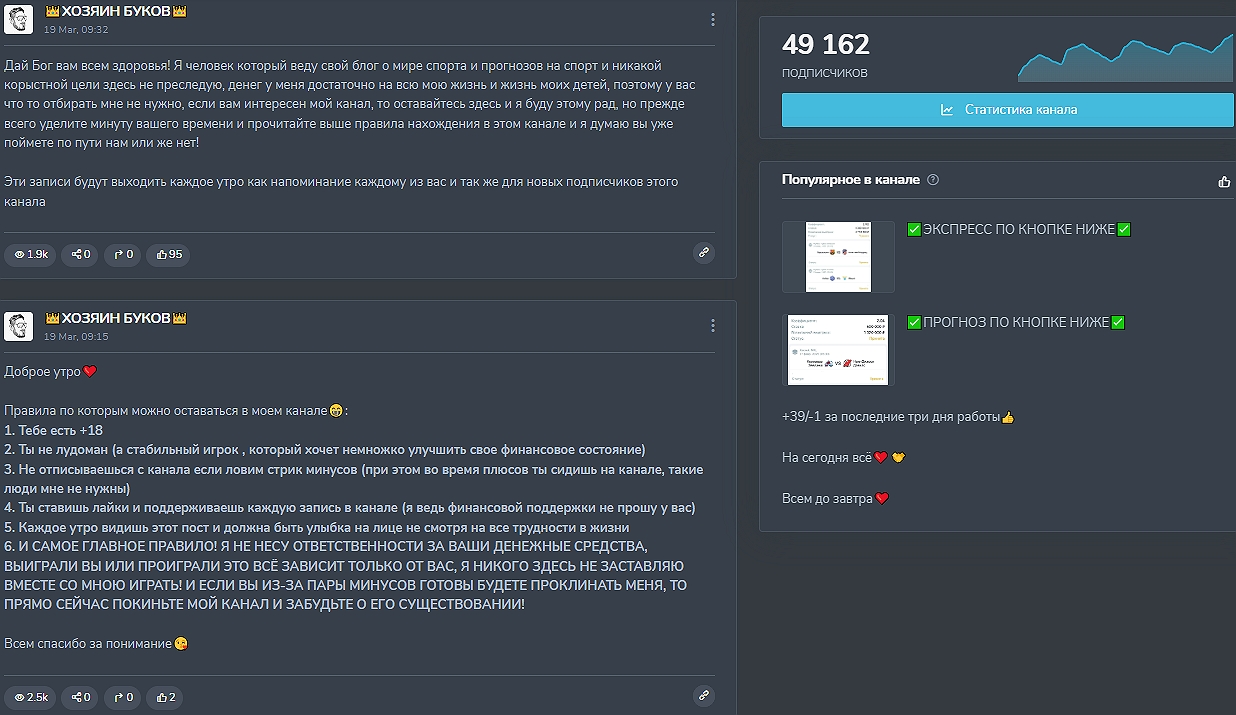 В мошенничестве на проекте нет сомнений, ведь под вывеской «Хозяин Буков» работают два идентичных канала, один из которых размещен на адресе @stavkisport_m и еще недавно назывался «Сергей Ротенберг Блог Аналитика». Отзывы на персонажа резко негативные, что логично — @serotenberg «раскручивает депозиты» в тех же липовых БК и продает экспрессы за 5000 без эффекта для пользователей ТГ.