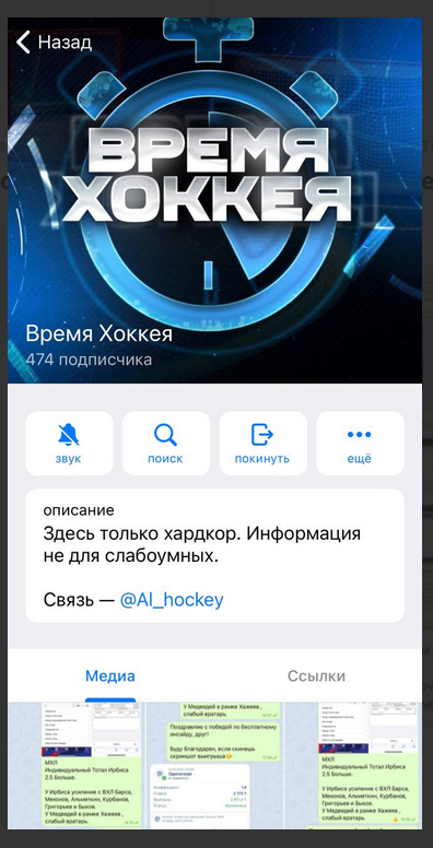 Время хоккея - телеграмм-канал, спецификой которого являются прогнозы на ставки по спорту, в основном хоккея. Я не стал бы доверять данному паблику в связи с тем, что аудитория накручена, аналитика слабая, гарантий нет и что не менее важно- отсутствует верификация