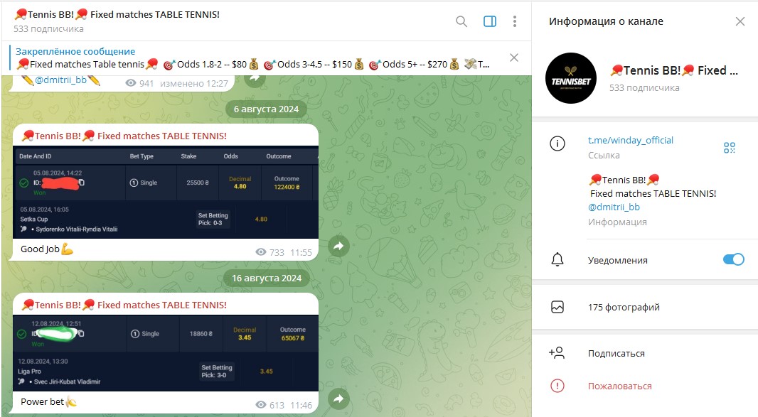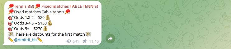 Сейчас в самом канале Tennis BB! Fixed matches TABLE TENNIS! можно встретить такие объявления: