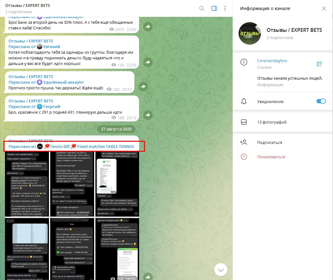 Чтобы Вам было понятно, ранее проект Win Day в telegram назывался EXPERT BETS. Имя и описание было изменено несколько раз, и на данный момент он известен как Tennis BB! Fixed matches TABLE TENNIS!. Это огромный минус к репутации и рейтингу ресурса.