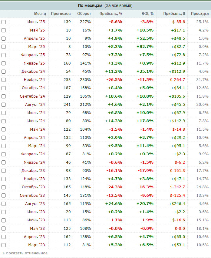 По графикам Bet-Hub видно, что чистая прибыль за все время деятельности каппера +41,6%. Всего он сделал 3 160 прогнозов из них 2706 прогнозов со 100% верификацией. Статистика собирается с марта 2023 года.