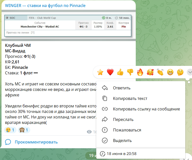 В телеграмм канале каппер не закрывает комментарии. Негатива в них нет, а активность аудитории в 41% показывает, что его контент интересен. Реакции не ограничены только позитивными эмодзи. Вы можете полноценно выражать свое мнение под публикациями.