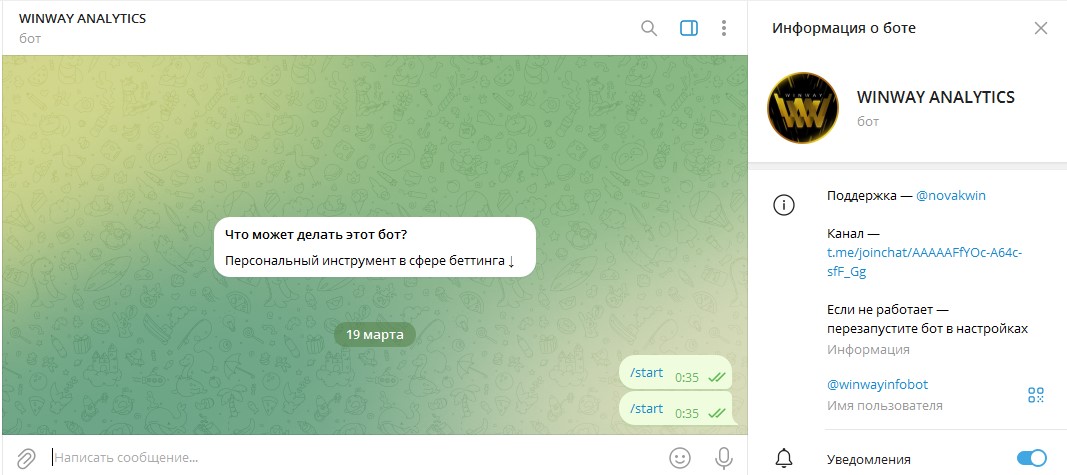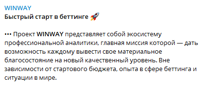 WinWay – очередной каперский ресурс, который функционирует в telegram и состоит из нескольких площадок. Основной тематикой проекта является беттинг, а также предоставление клиенту сигналов для ставок на спортивные матчи. Причем автор предлагает как бесплатные, так и платные прогнозы.