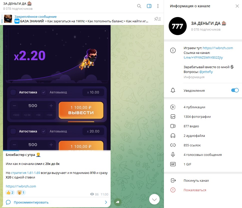 Разбор проекта За деньги да наша команда сделала не случайно. Этот телеграмм канал предлагает своей аудитории якобы рабочие схемы обмана казино и гарантирует доход от сомнительных азартных игр.