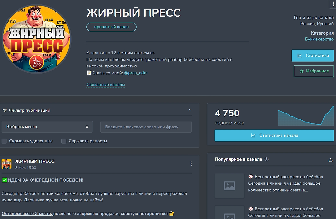 Жирный Пресс — проект капера Кирюхи, представляющего игрокам «лучший продукт» для заработка на MLB. Судя по контенту, за полтора месяца ставок аноним должен был стать рублевым миллионером, но персонаж зачем-то выманивает у подписчиков деньги за вип-чат, штучные ординары и экспрессы. Разберемся, чего добивается неопознанный индивид, неотличимый от сотен сомнительных коллег по Telegram.