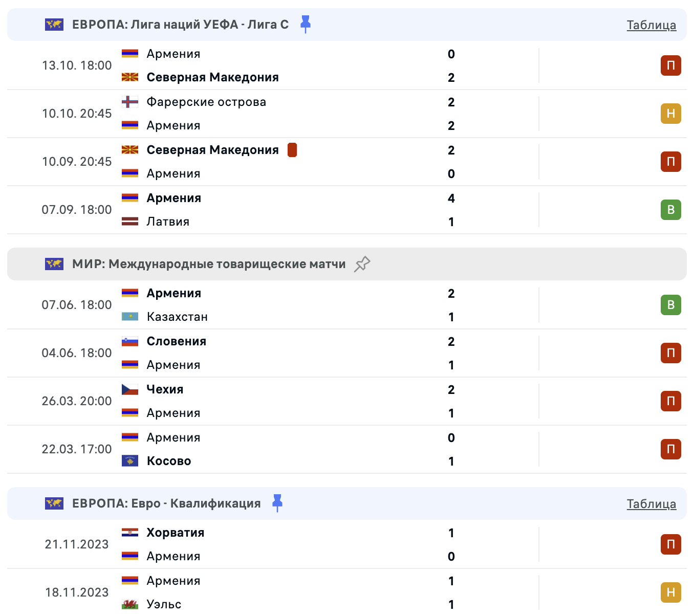 Из 4 товарищеских матчей проиграно было 3. Армения смогла победить команду Казахстана 2:1. А вот в Лиге Наций дела чуть лучше. 4:1 обыграна Латвия, 2:2 – ничья с командой Фарерские острова. Ещё в 2 случаях сильнее была Северная Македония, оба раза с одинаковым счётом 2:0.
