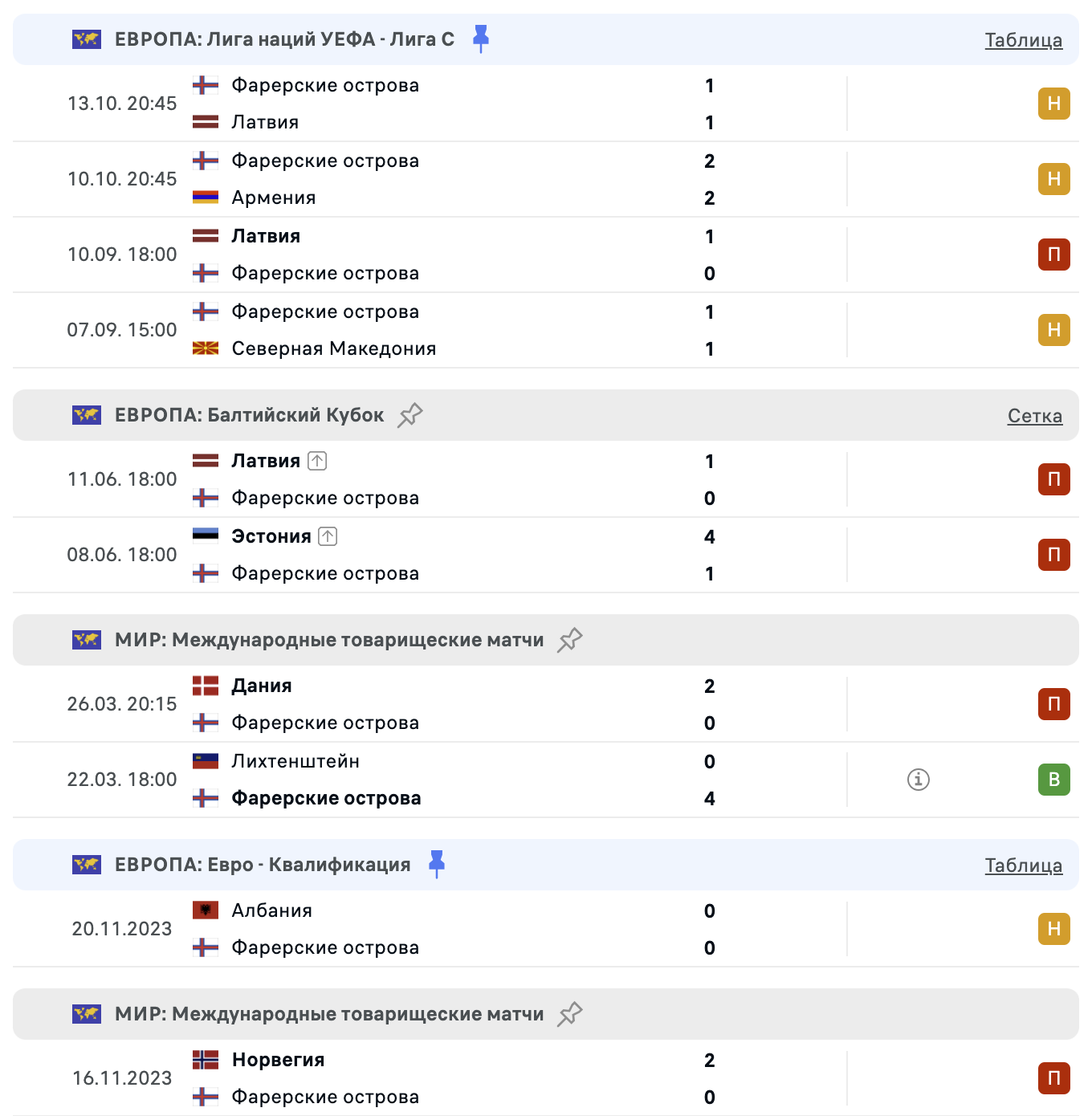- Фарерские острова забивали в 3 из 4 прошедших матчей;