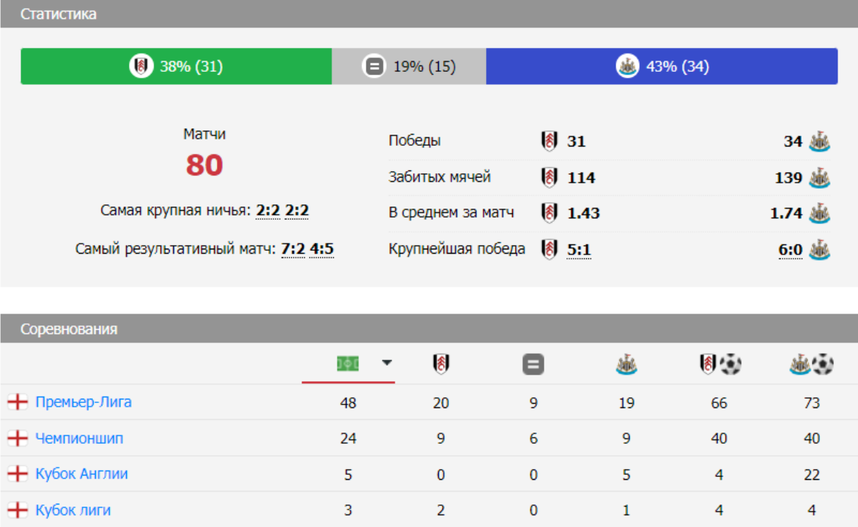Результаты очных противостояний Фулхэм – Ньюкасл
