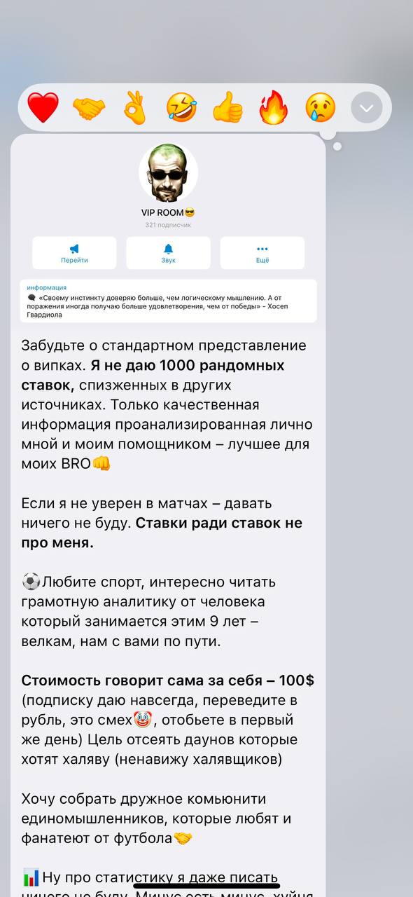 Готов дать фидбек о випке) Купил я ее неделю назад, но вывод уже можно сделать. Чудак кайфует от того что делает, это однозначно. Проходимость понятное дело скачками, стату публикует. Но расписывает матчи он круто, не банальные ставки. В целом наблюдать интересно, особенно с тем учетом, что подписка навсегда дается.