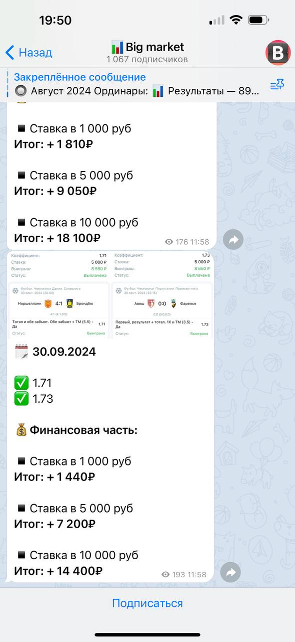 Канал ведется сдержанно, нет 1000 постов и постоянных призывов покупать. В основном, контент канала состоит из бесплатных матчей и отчетам по платным подпискам, о которых мы расскажем позже.