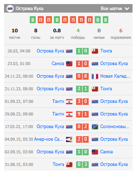 Итоги встреч показывают: состав мало что из себя представляет, проигрышей много. Но сейчас мы анализируем перспективы борьбы со сборной Тонга. И тут все немного лучше: с этим составом было сыграно 3 игры и во всех команда Острова Кука одержала победу.