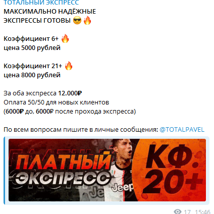 Некий Павел Черников ведет Телеграмм-канал, который на сегодня насчитывает около 3 000 подписчиков. Информация с независимых источников показывает, что раннее на ресурс было подписано более 40 000 человек. Предполагаем, что пользователи были удалены после жалоб на накрутку, или же аналитик создал новый канал с аналогичным названием и заново набирает аудиторию. Если говорить об активности, то она низкая. Посты не набирают и 100 просмотров. Личность каппера неизвестна. Информация о команде не была обнаружена, вероятно прогнозист работает один. Тотальный экспресс отзывы закрыл.
