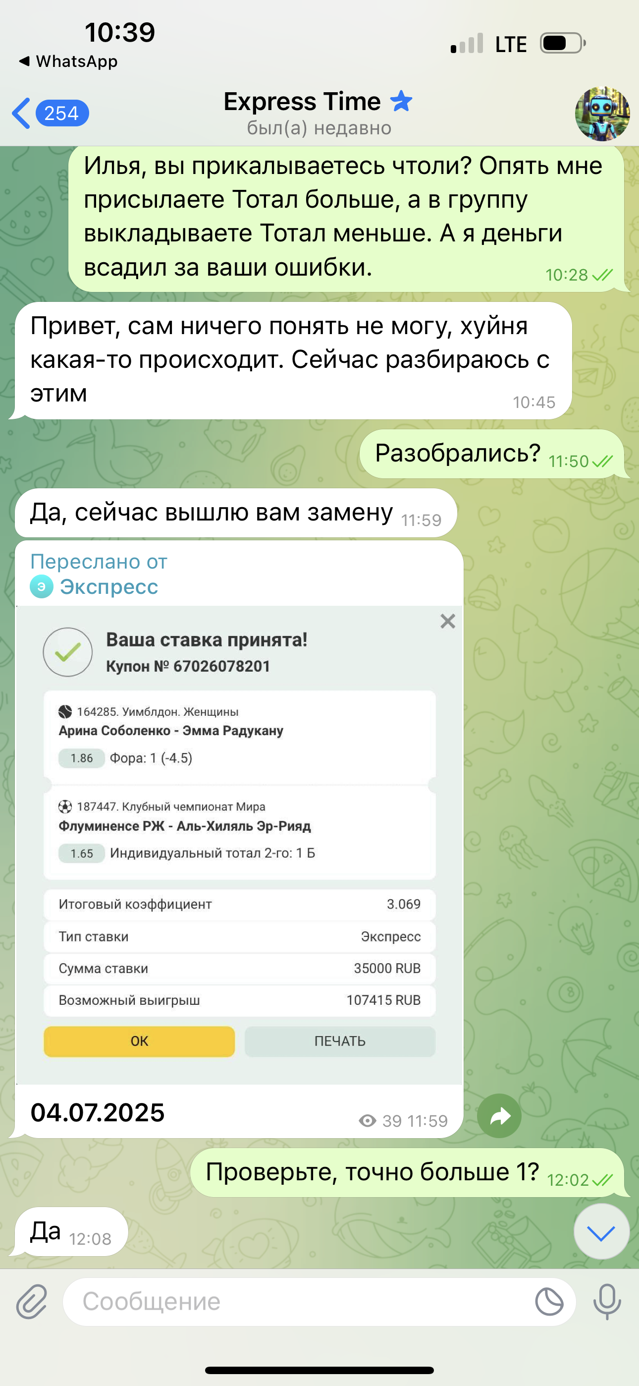 Это развод, не ведитесь. Схема такая: рассылают желающим экспресс, из двух событий: одной половине, например, тотал голов больше 2,5, а другой половине тотал голов меньше 2,5. В какую половину попадешь ты, чистая удача. А довольных клиентов, а стало быть скринов с победным результатом полно, выкладывай, других лошков набирай. А на следующий день в группе выкладывают тот вариант, который сыграл, и что все офигенно, все сыграло. На претензии, почему так, что прислали один вариант, а сыграл полностью противоположный, ответ один - произошла ошибка рассылки и тд. Это не экспертные проанализированные экспрессы, а чистая шара. С таким же успехом, самому можно составлять прессы, когда-то сыграет хоть один. Прикреплю скрин переписки. Не прикрепляется более одного фото тут - суть одна везде отмазки, Типа, ой я в а…уе, как так произошло, это ошибка. На фото вчерашний экспресс, где по экспрессу должна была Соболенко с форой +4,5, а у них в телеге выиграл экспресс Радукану Ф-4,5. Такая простая схема развода. Не ведитесь.