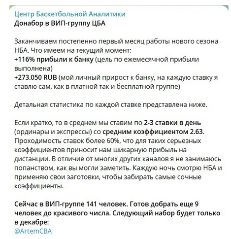 Артем ЦБА продает ВИП рассылку, где, как он сообщает, представлены наилучшие пари на баскетбол. Он нигде не афиширует платные прогнозы, с каждым клиентом занимается индивидуально. Заказывать услуги по аналитике необходимо в личке – @ArtemCBA.
