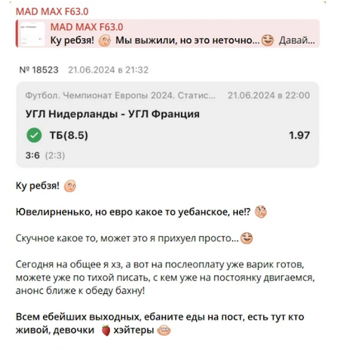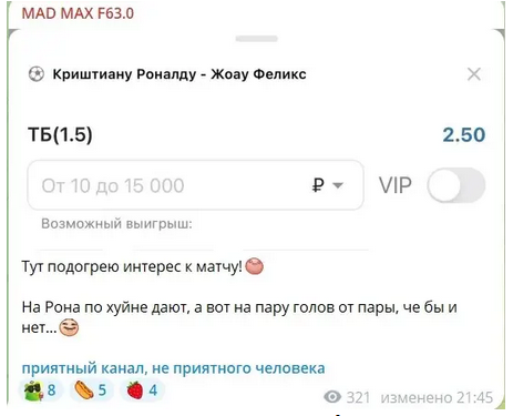 Проверив капперский канал в Телеграмм MAD MAX F63 0, мы можем поделиться с вами итогами: